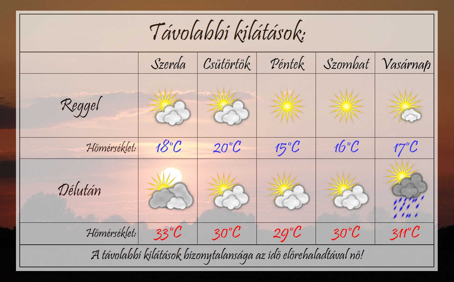 A hét második felében marad a nyári idő kevés felhővel és sok napsütéssel. Reggelente 15°C-ig csökken a hőmérséklet, míg napközben 30°C-ig kúszik fel a hőmérő higanyszála. Igazi nyugodt, strandidő várható.