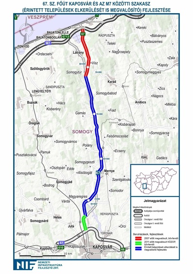 Tavaly év végén minden tekintetben elkészült a 2x2 sávos 67-es út 37 kilométeres szakasza a Strabag Építő Kft., a Strabag AG és a Soltút Kft. munkájával. Így jelenleg az út két végén van szükség egy-egy rövidebb 2x2 sávos szakasz kiépítésére, hogy a Somogytúrtól Kaposvárig elkészüljön a fejlesztés.