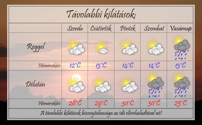 A hét második felében kellemes nyári idő várható sok napsütéssel és kevés csapadékkal. Reggelente friss 12-14 °C-ig csökken a hőmérséklet, míg napközben 25-27 °C-ig kúszik fel a hőmérő higanyszála. Igazi augusztusi idő várható.