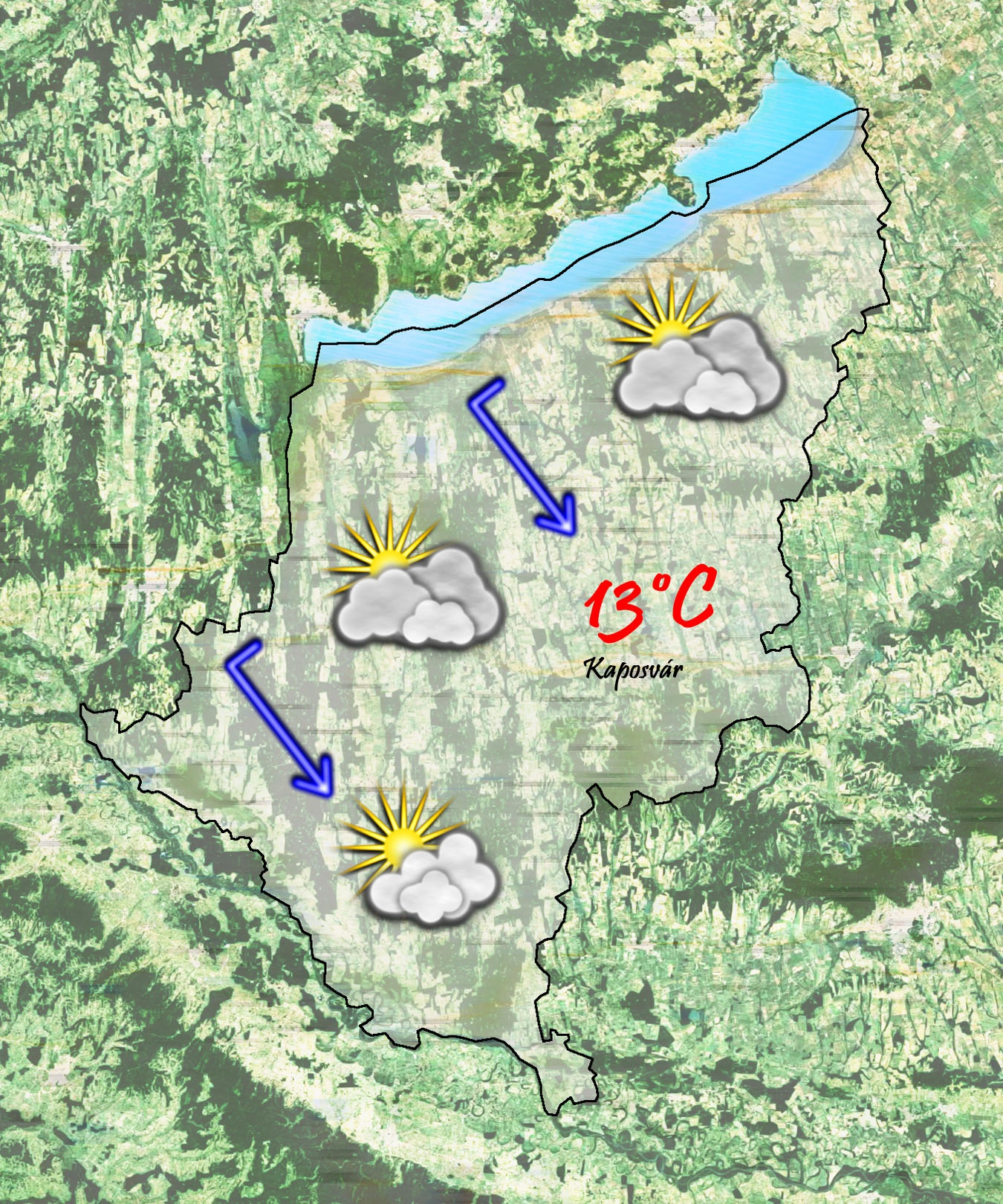 Vasárnap reggel is sok felhő lesz az égen. 4°C-ig süllyed a levegő hőmérséklete. Napközben közepesen felhős időre készülhetünk, de csapadék nem várható. 15°C-ig emelkedik a hőmérséklet. A szél továbbra is északnyugat felől fog fújni.