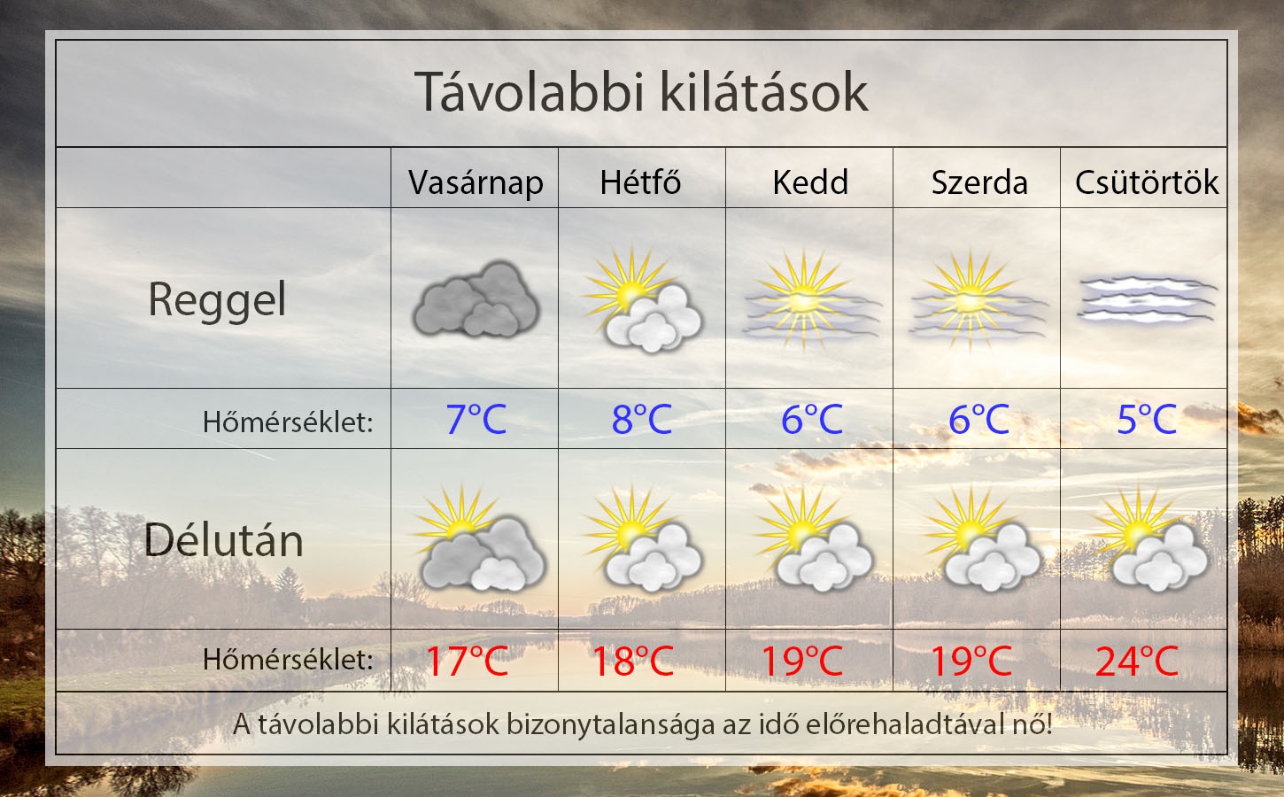 A jövő hét elején kevesebb lesz a felhő, ám egyre több helyen lehet reggelente köd, mely akár nappal is megmaradhat. Ahol feloszlik a köd ott napos, kellemes idő várható. Reggelente 5-10 °C közé hűl a levegő, míg napközben akár a 20 °C-ot is elérheti a csúcshőmérséklet.