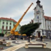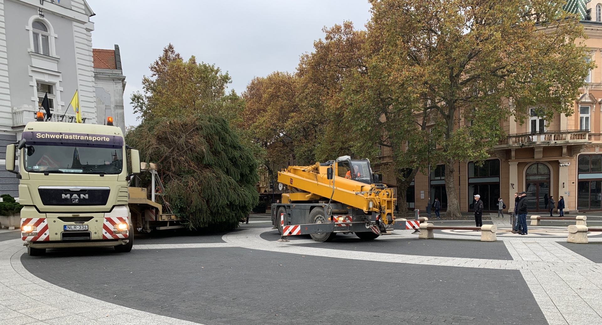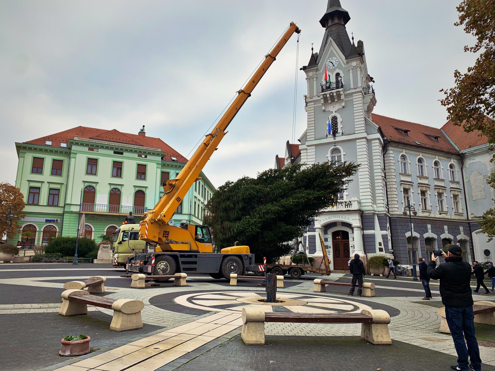 A mintegy 14 méter magas lucfenyőt egy helyi vállalkozás ajánlotta fel a város számára, amelyet kedden reggel vágtak és szállítottak a Kossuth térre.