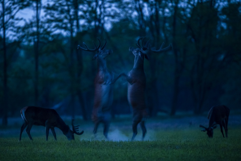 Az egymással küzdő szarvasokat este sikerült elkapnom, ami nehezített körülmény volt, hiszen nem voltak megfelelőek már a körülmények a fotózáshoz