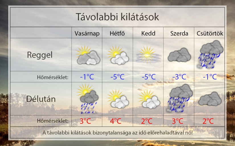 A jövő hét elején csökken a felhőzet de emiatt hidegebb idő is várható. Reggelenként a hőmérséklet mélyre süllyed. Akár -5°C-nál is hidegebb lehet, míg napközben 0+4°C körül várható a hőmérséklet.