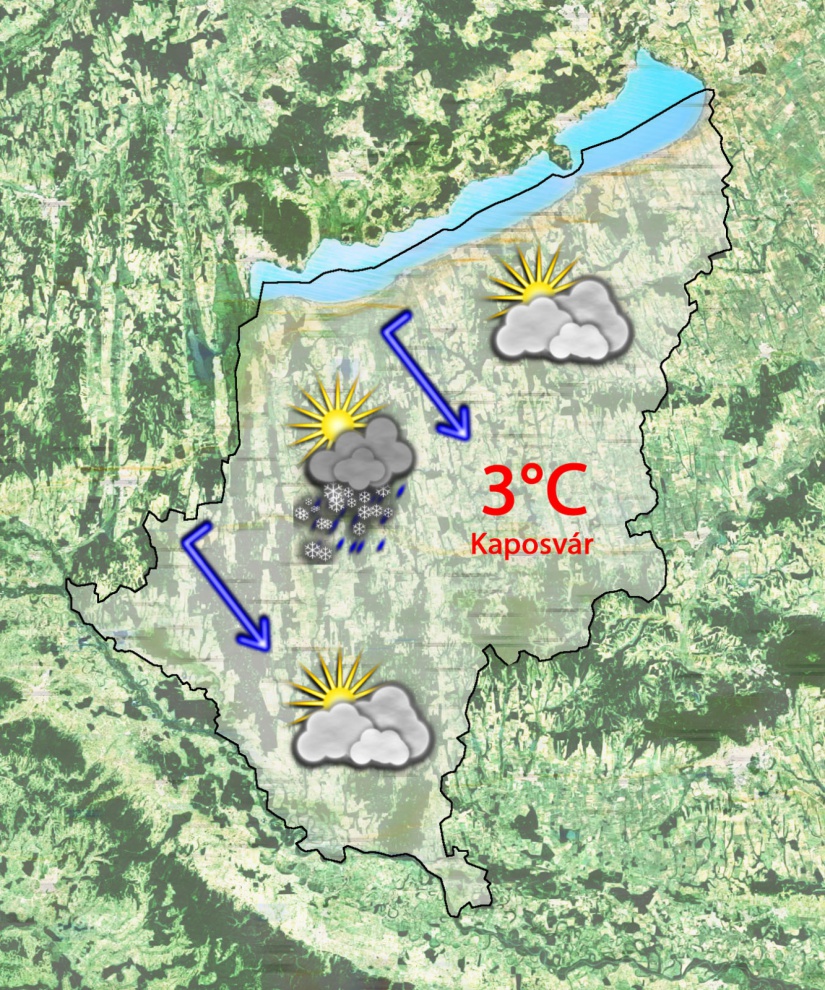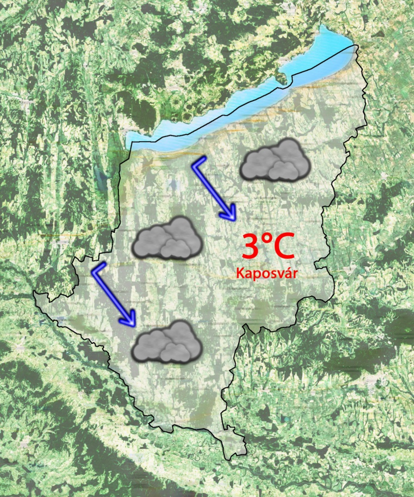 Vasárnap reggel erősen felhős lesz az ég és -1°C-ig süllyed a levegő hőmérséklete. Napközben az erősen felhős, borongós ég mellett 4°C-ig emelkedik a hőmérséklet. Néhol előfordulhat egy-egy futó hózápor, havaseső-zápor. A szél északnyugat felől fog fújni.