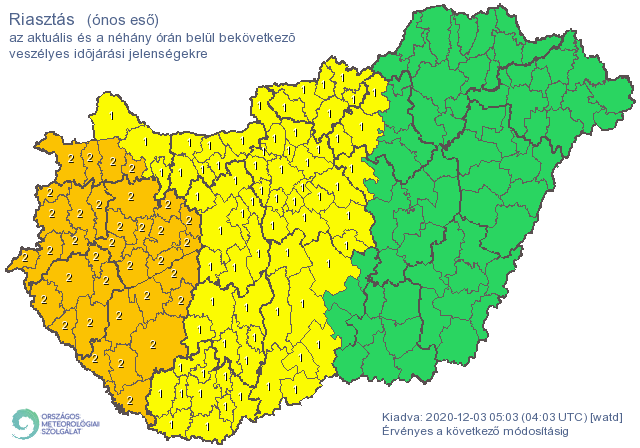 Délelőtt fokozatosan egyre több helyen olvadás várható. A csapadék formája napközben egyre nagyobb területen esőre vált át; vegyes halmazállapotú csapadék legtovább a nyugati határ mentén fordulhat elő, egyre gyengülő intenzitás mellett.