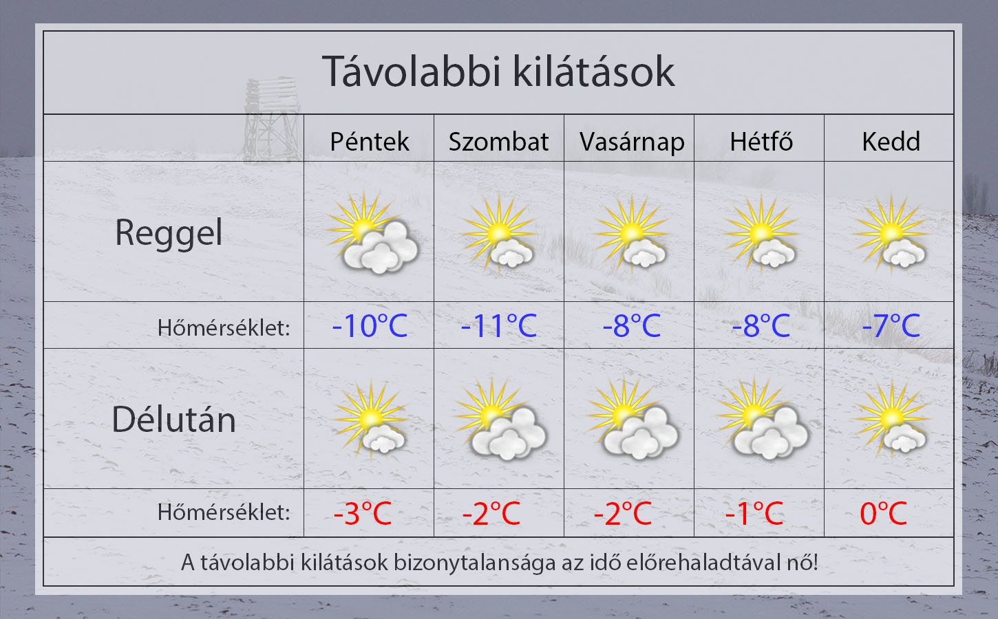 Péntek reggelre csökken a felhőzet és a mérsékelt, olykor élénk északnyugati szél mellett -8-10 fokig zuhan a hőmérséklet. Napközben gyengén felhős lesz az ég. Délután a hőmérséklet épphogy eléri majd a -3°C-ot.