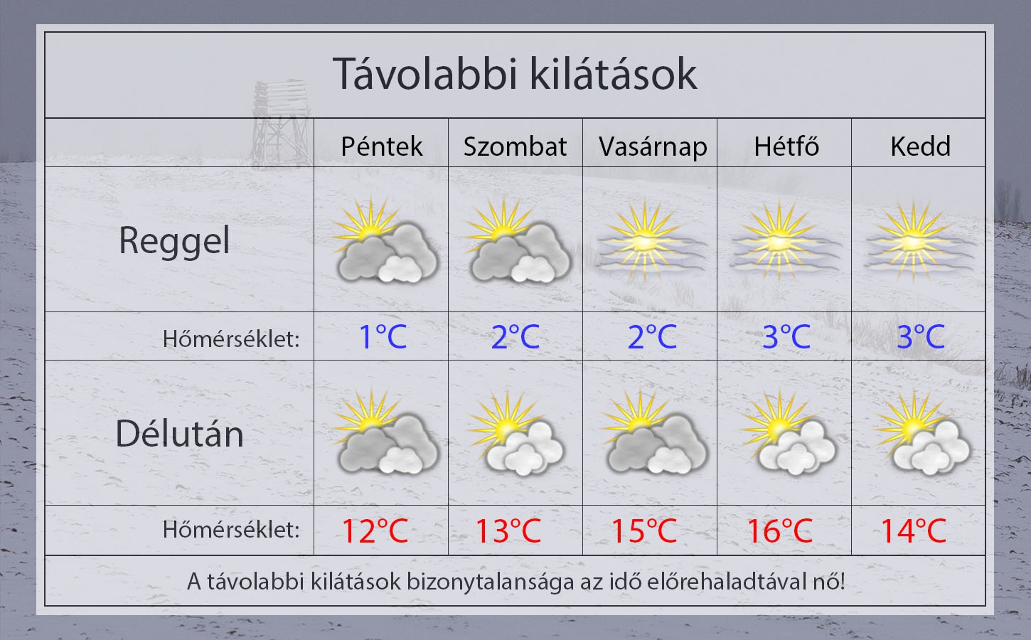 A hétvégén eleinte több, majd később kevesebb felhő lesz felettünk. Reggelente néhány fokig süllyedhet a hőmérséklet. Fagy csak néhol valószínű. Napközben 13-15 °C-ig emelkedik a hőmérő higanyszála. A jövő hét elején tovább enyhül az idő, így hétfőn akár 15 °C-nál is melegebb lehet.