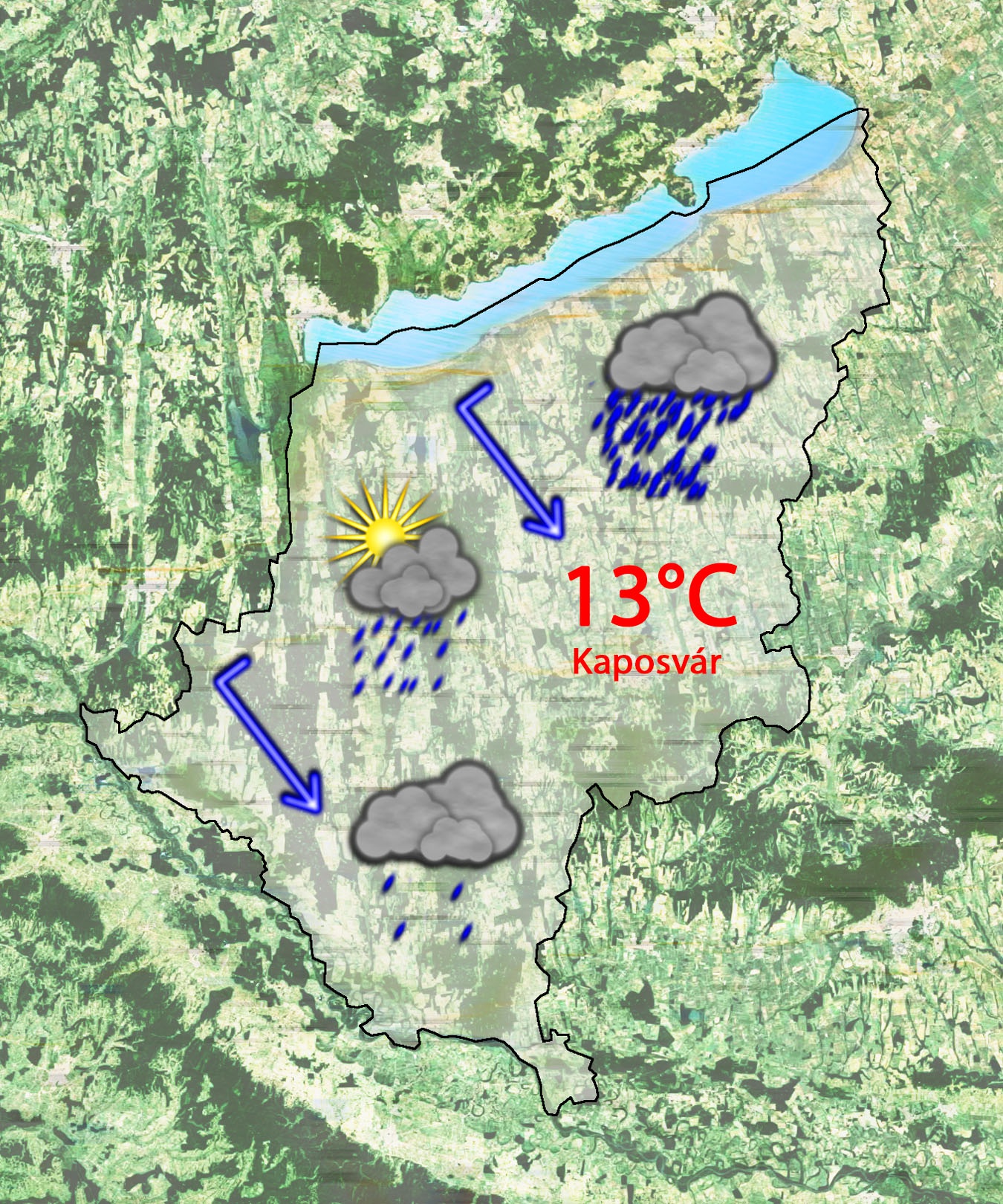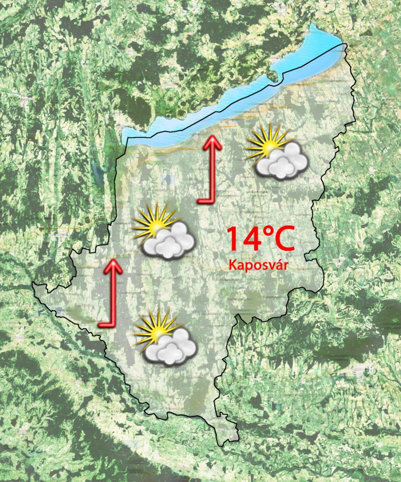 Szombat reggel a felhőzet lassan csökkenni kezd és 4 fokig süllyed a hőmérséklet. Napközben közepesen felhős lesz az ég és 14°C-ig kúszik fel a hőmérő higanyszála. Mérsékelt délnyugati szél fog fújni.