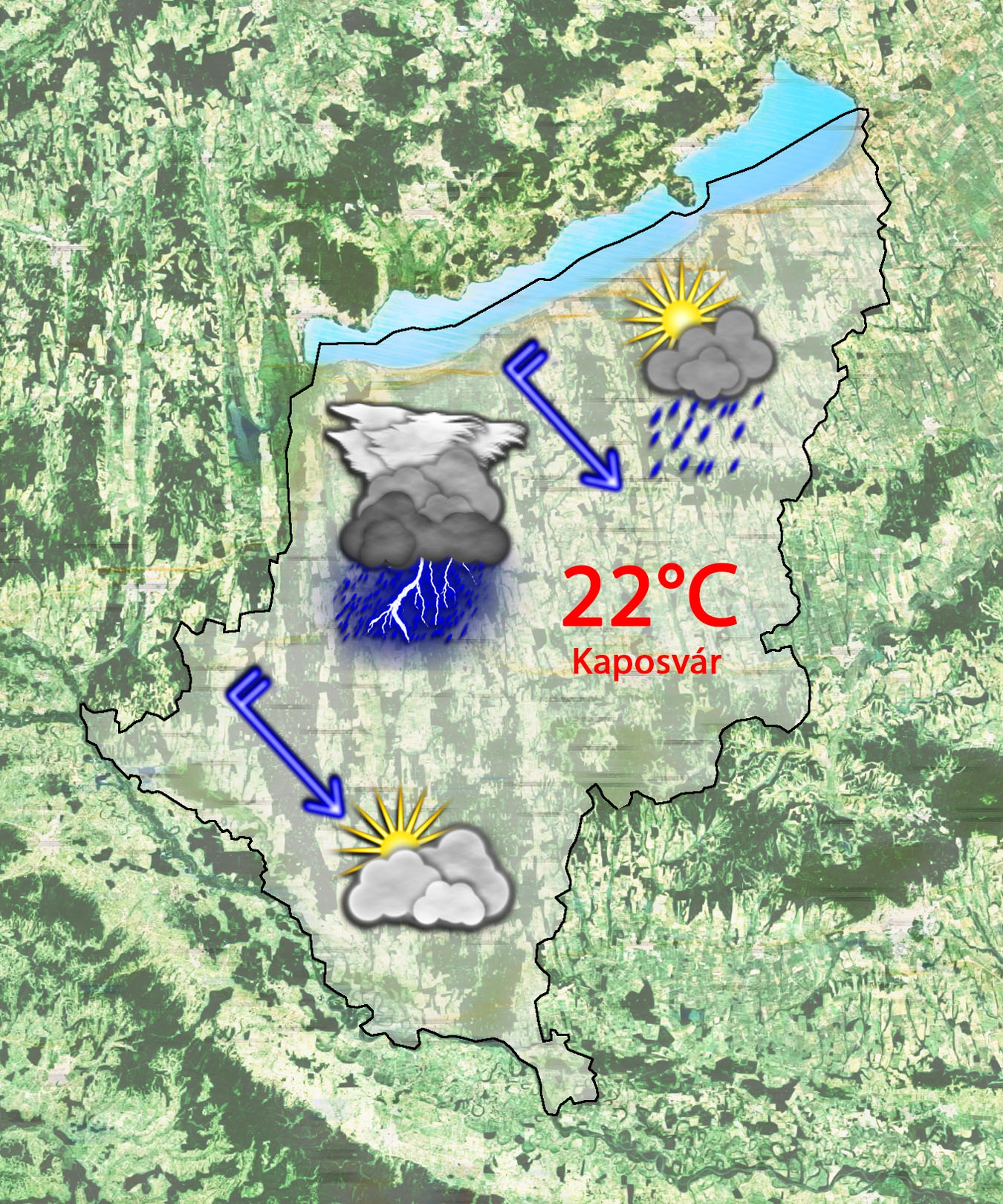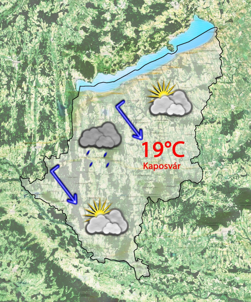 Szerda napközben eleinte gyengén felhős lesz az ég, majd délután egyre inkább megnövekszik a felhőzet. 22°C-ig melegszik a levegő hőmérséklete. Késő délután záporokkal,zivatarokkal megérkezik a hidegfront. Eleinte mérsékelt délnyugati szél fúj majd, azonban frontátvonuláskor viharos északnyugati széllökések lehetnek.