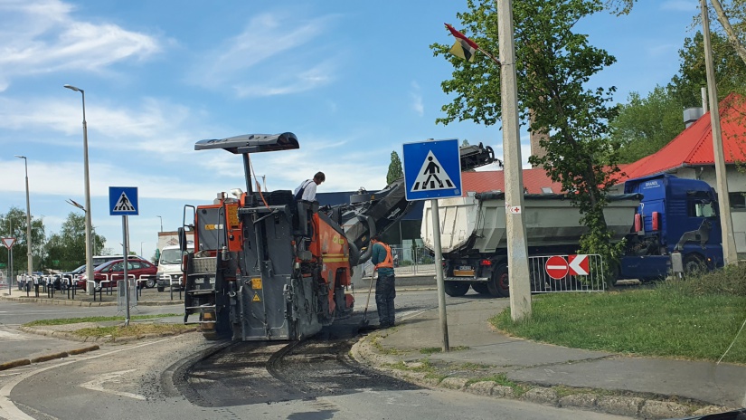 A Vásártéri úton azonban már megkezdődött az aszfaltozás, 14 óra körül éppen a benzinkút környékén dolgoztak a munkások.