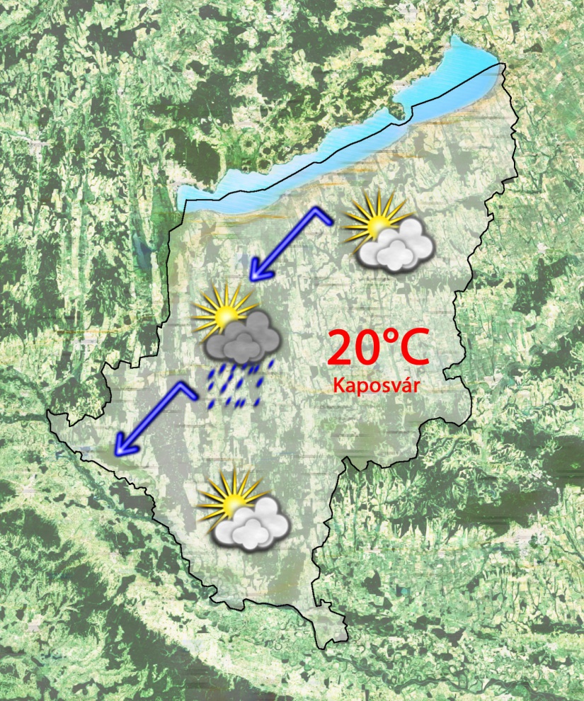 Kedd reggel közepesen felhős lesz az ég és 7°C-ig süllyed a hőmérséklet. Napközben változóan felhős, enyhe idő várható, és ismét esély van záporra, esetleg zivatarra. Délután 20 fokig emelkedik a hőmérő higanyszála. Gyenge északkeleti szél fúj majd.