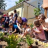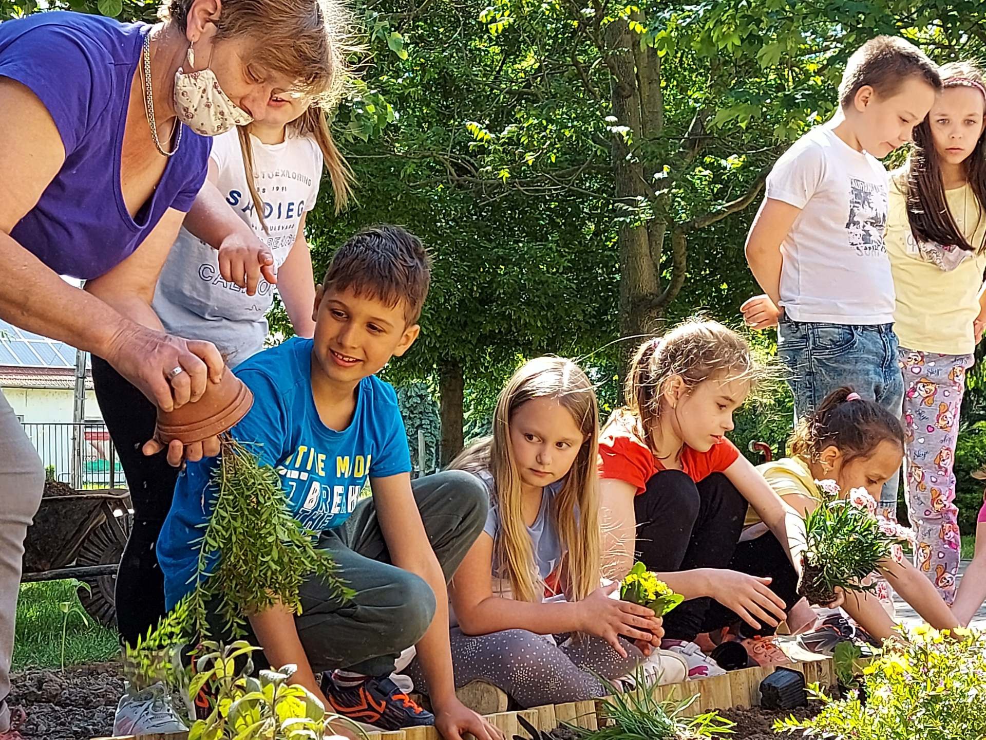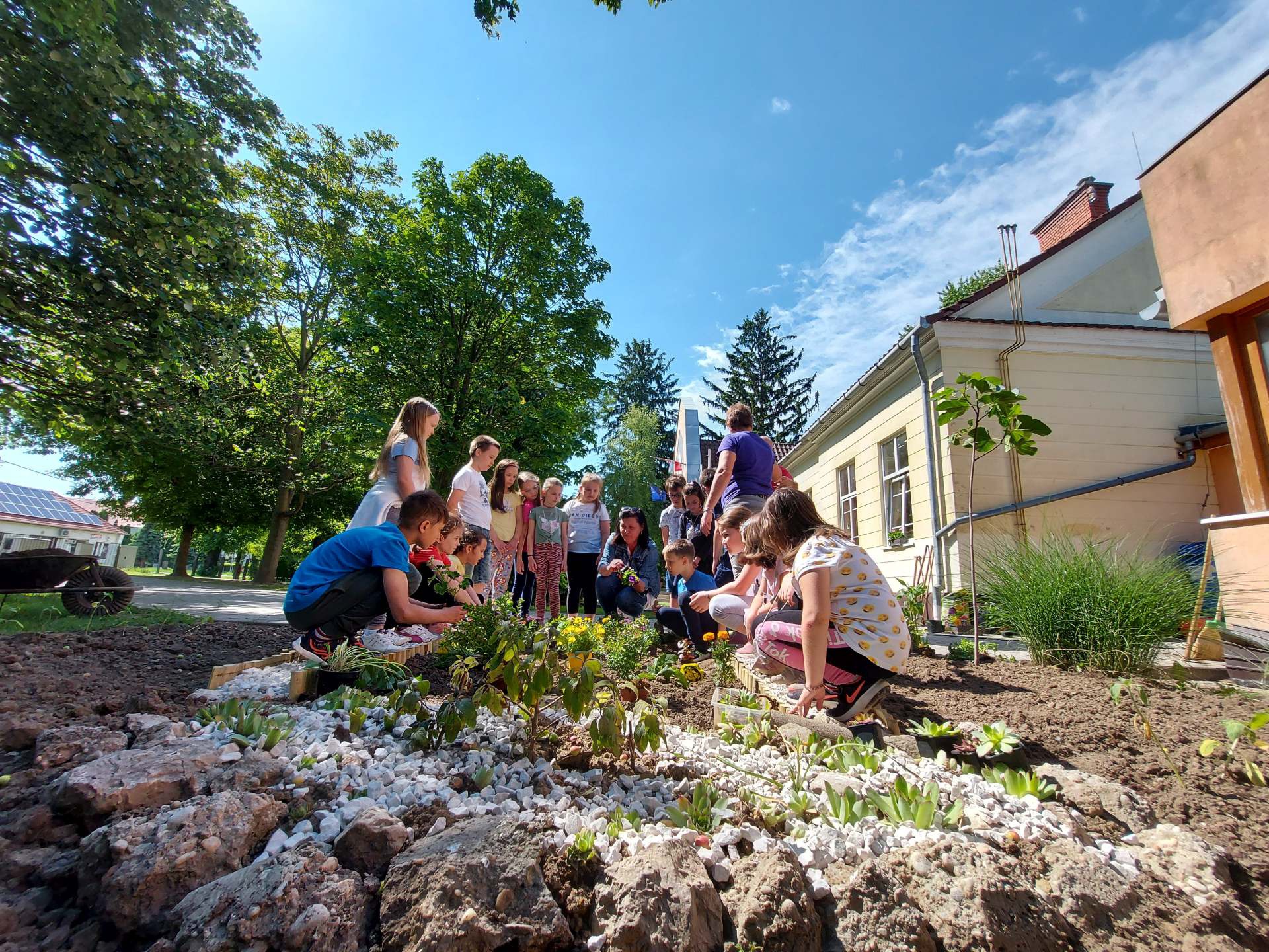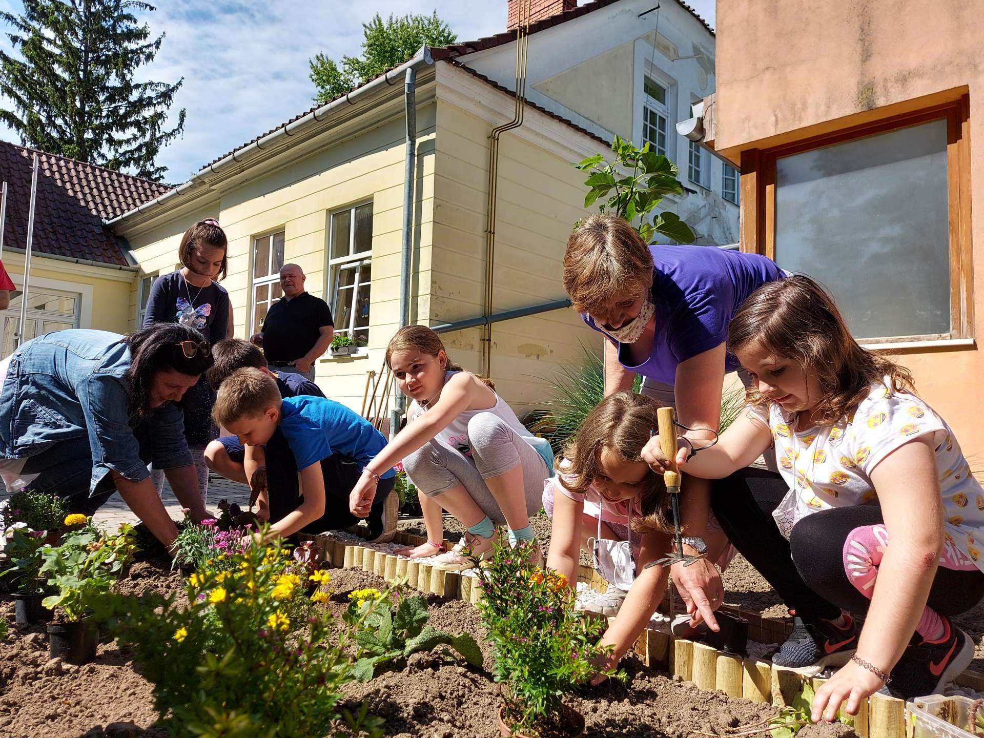 Beszínesítették az iskola parkját a virágzó növényekkel.