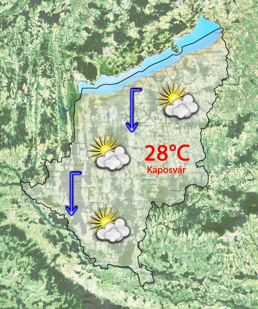 Szerdán reggel 13 °C-ig csökken a hőmérséklet. Napközben 28 °C-ig melegszik a levegő. Sokat fog sütni a nap. Délután lehetnek gomolyfelhők az égen, de csapadéktól még nem kell tartani. A szél továbbra is észak felől fúj majd.