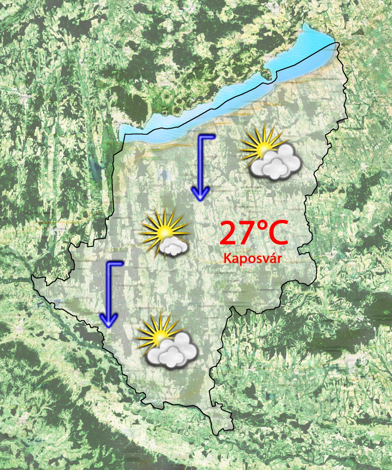 Kedd reggel közepesen felhős lesz az ég és 12 °C-ig süllyed a hőmérséklet. Napközben változóan felhős, meleg idő várható. Csapadékra nem kell számítani. Délután 27 °C-ig emelkedik a hőmérő higanyszála. Gyenge északi szél fúj majd.