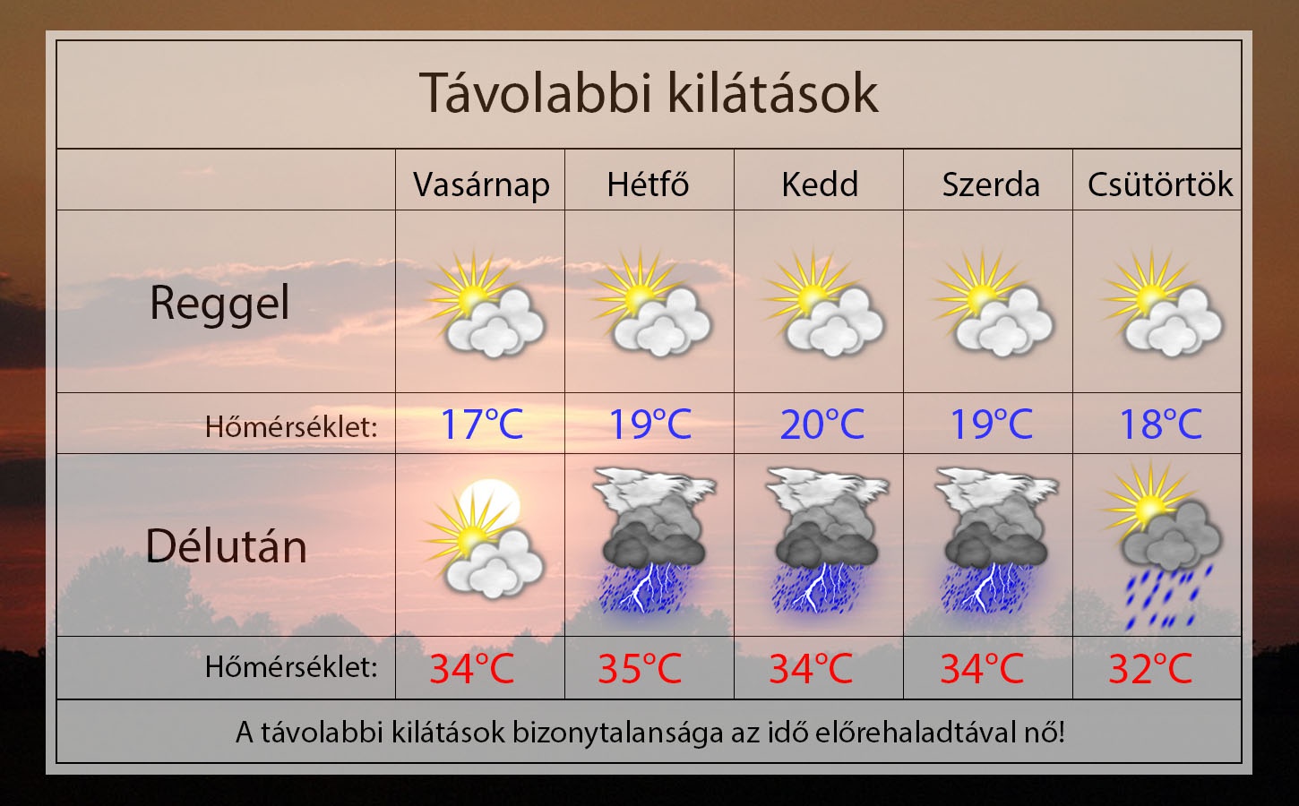A jövő héten megérkeznek a zivatarok a délutáni órákban, ám a hőség fokozódik majd. Reggelente 18-20°C környékére hűl a levegő, míg napközben 33-35 fok várható. Szerdán egy kisebb lehűlés hatására felfrissülhet a levegő, de addig fülledt délutánokra számíthatunk.