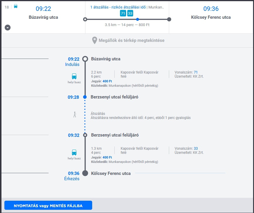 A kiválasztott útvonal térképen is megnézhető, ahol az egyes megállókat is megjeleníti a szolgáltatás. A listát pedig elmenthetjük vagy kinyomtathatjuk.