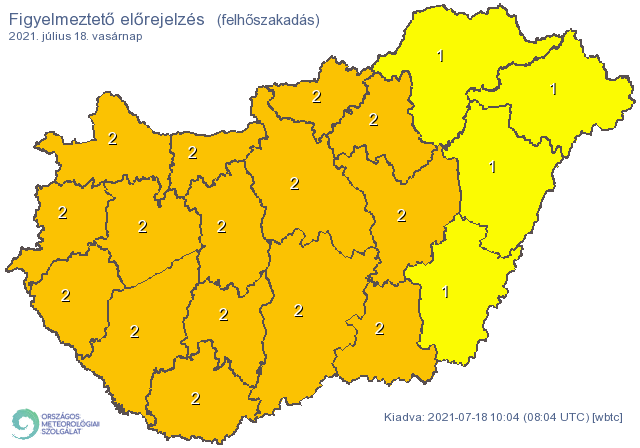 Az Országos Meteorológiai Szolgálat vasárnapi veszélyjelzése szerint a zivatarveszély miatt az egész országban elsőfokú figyelmeztetés van érvényben.