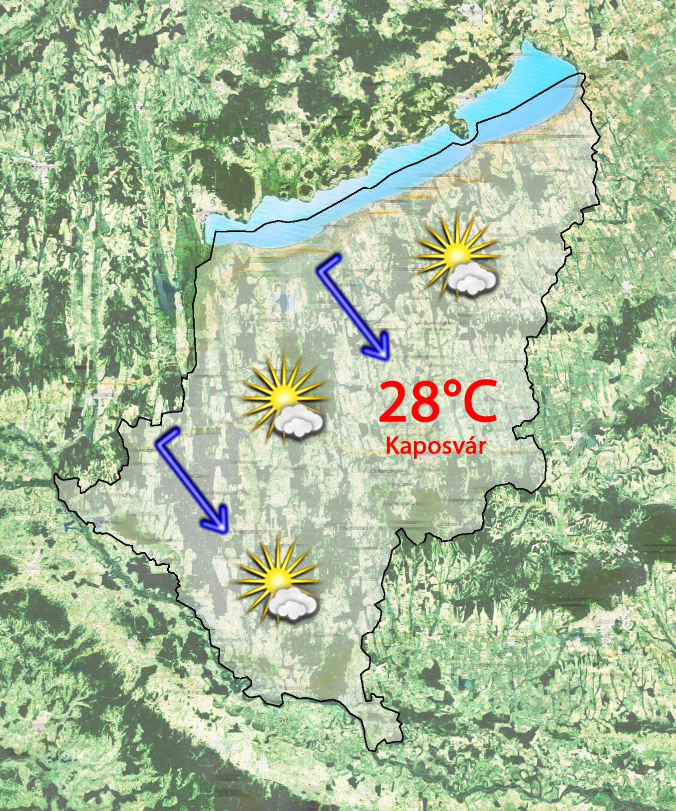 Szerda napközben közepesen felhős lesz az ég és 26°C-ig melegszik a levegő hőmérséklete. A szél északnyugatról fog fújni gyengén, olykor mérsékelten.