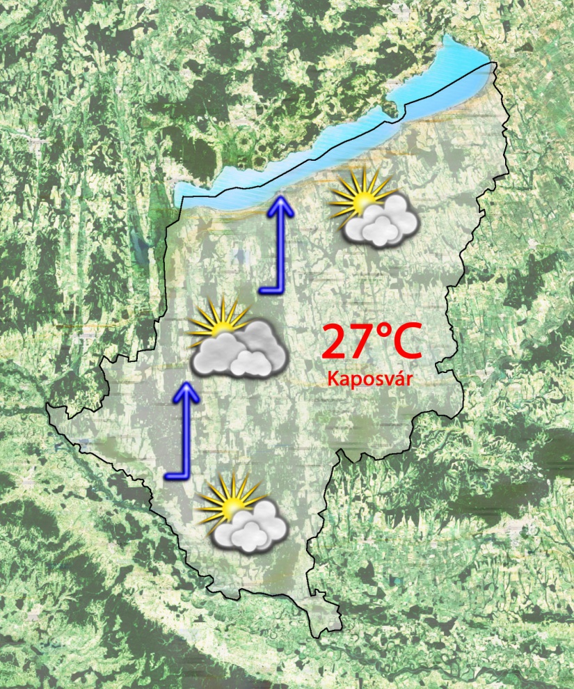 Kedd reggel erősen felhős lesz az ég és 17 fokig süllyed a hőmérséklet. Előfordulhat záporeső. Napközben változóan felhős, kellemesen meleg idő várható. Délután 27°C-ig emelkedik a hőmérő higanyszála. Gyengén fog fújni a déli szél.