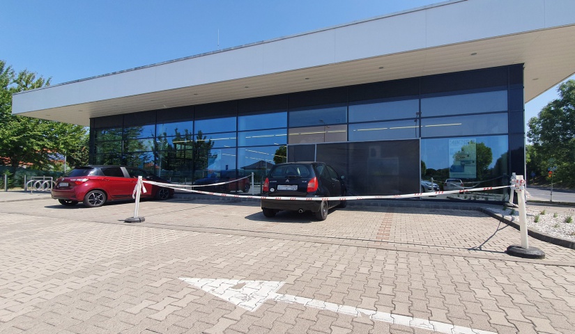 Hétfőn jártunk a helyszínen is, a fotón jól látszik, hogy a betört üveget egyelőre egy fekete fóliával pótolták, az előtte lévő területet pedig elzárták az autósok elől.