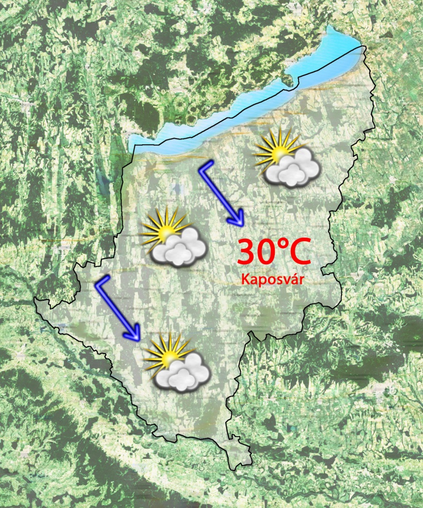 Szombat reggelre közepesen, olykor erősen felhős lesz az ég és 14 °C-ig csökken a hőmérséklet. Napközben a változóan felhős ég mellett 30 °C-ig kúszik fel a hőmérő higanyszála. Északnyugati felől fúj majd gyengén a szél.