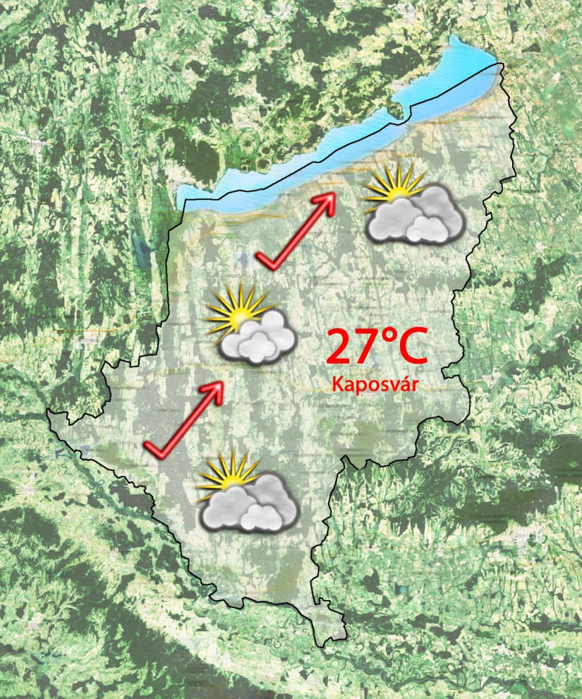 Csütörtök reggel 13°C-ig csökken a hőmérséklet a már erősen felhős ég alatt. Napközben közepesen, fátyolfelhős lesz az ég. Délután 27° fokig szökik fel a hőmérő higanyszála a gyenge délnyugati szél mellett.