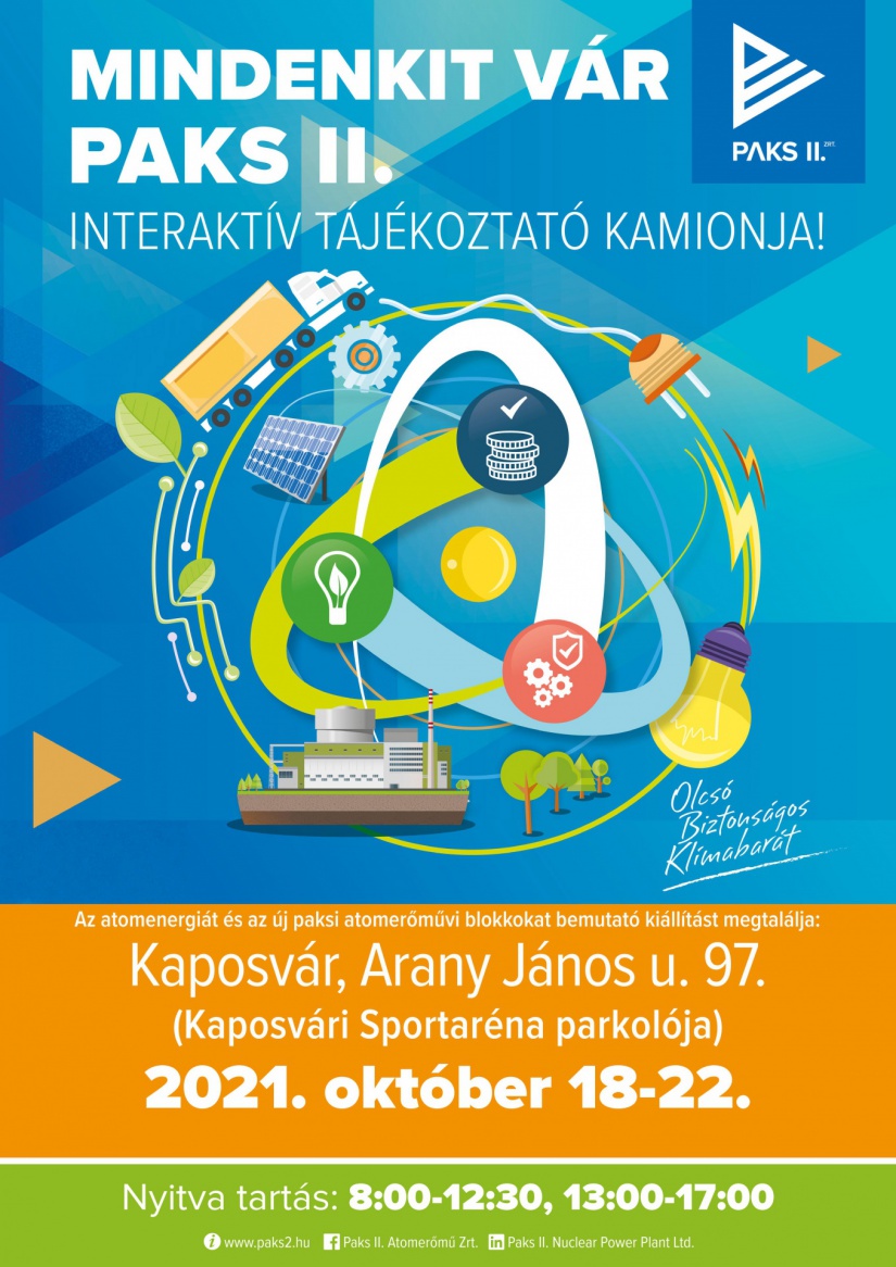 Az országjáró, interaktív kiállítás október 18-től 22-ig lesz megtekinthető a Kaposvár Aréna parkolójában. Többek közt a Pakson üzemelő négy, illetve a tervezett két új blokkot mutatják be a kamionban.