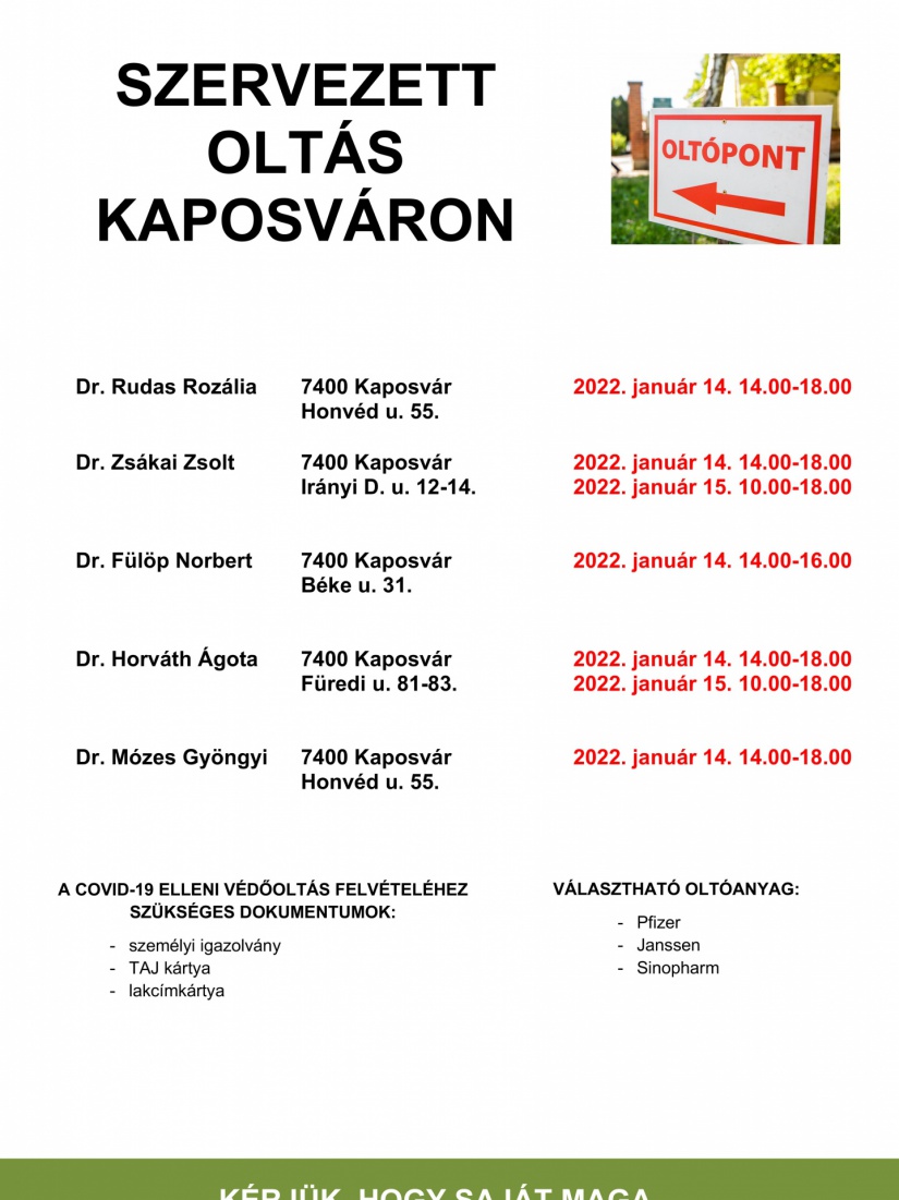 Az átoltottság további növelése és a járvány ötödik hullámának megfékezése érdekében ezen a héten is oltási akciónapokat tartanak egyes kaposvári háziorvosok pénteken és szombaton. A szakemberek továbbra is várják az oltatlanokat, illetve azokat is, akik már 4 hónapnál régebben kapták meg a korábbi oltásukat. A harmadik oltás felvételével ismét 80-90 százalékra emelhető a védettségünk.