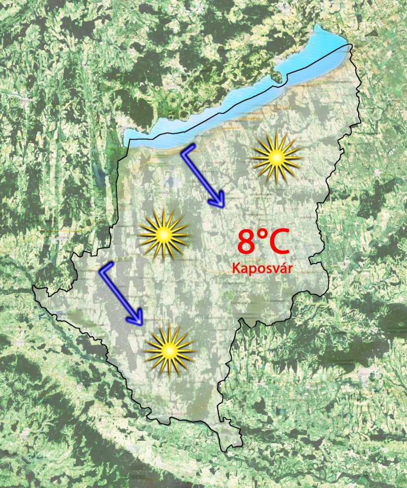 Szombat reggelre 0°C-ig csökken a hőmérséklet. Napközben változóan felhős lesz az ég és délután ismét 8 fokig kúszik fel a hőmérő higanyszála. Északnyugat felől fúj majd gyengén a szél.