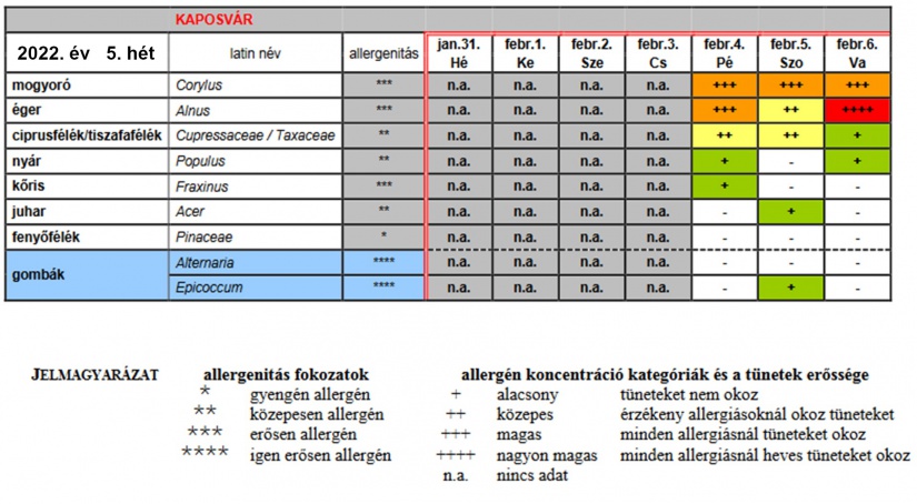 Az országos – tehát nem területekre lebontott – helyzetjelentés is az éger, a mogyoró, valamint a ciprusfélék/tiszafafélék koncentrációját jelzi, igaz mindegyiket „csak” közepes szinten, de látható, hogy hazánkban ezek túl már elindult a kőris, nyár, juhar és fenyőfélék pollenszórása is.