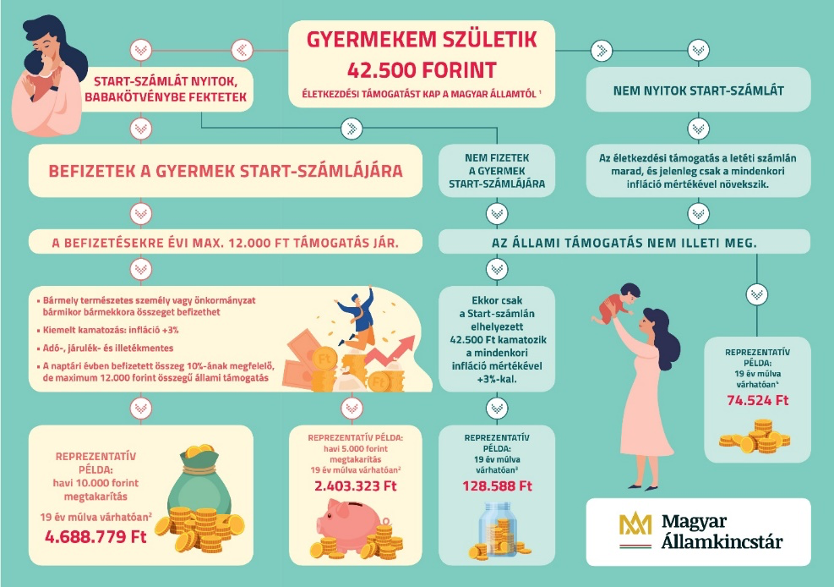 Az itt elhelyezett összeg kiemelt, az inflációt meghaladó mértékű kamatozással gyarapodik a gyermek nagykorúvá válásáig. A Kincstárban eddig körülbelül 273 ezer gyermek részére nyitottak Start-számlát, a Babakötvény-állomány összege eléri a 157 milliárd forintot.