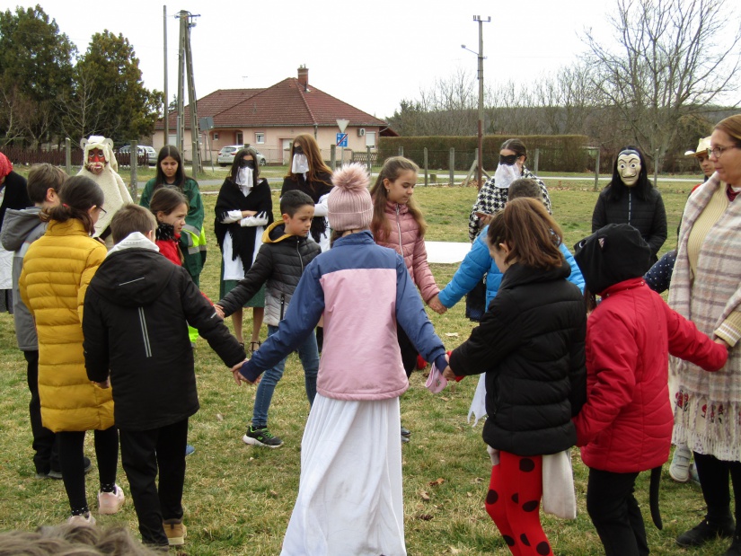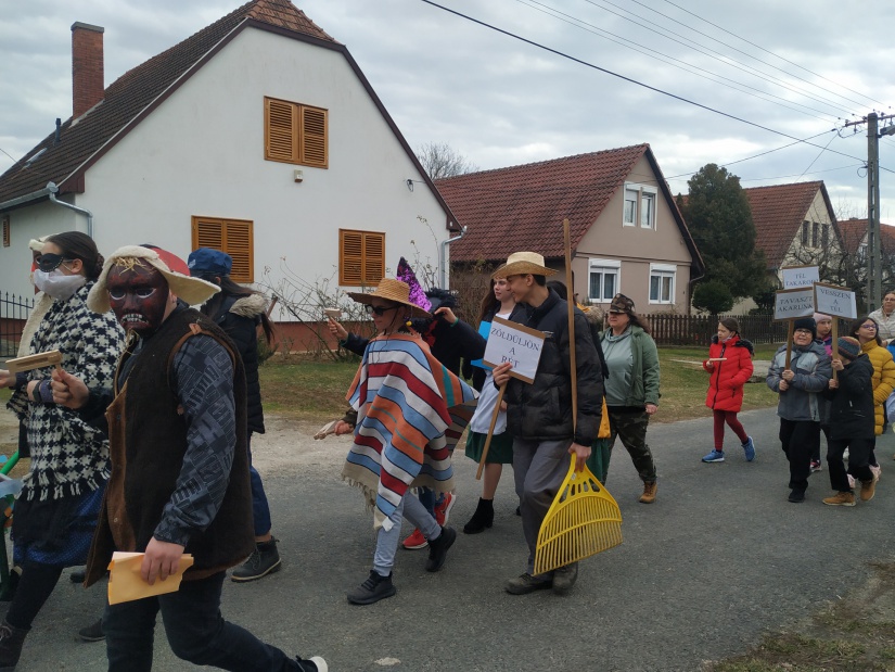 A farsangi jelmezbe öltözött lelkes DÖK tagok és néhány felsős diák zajkeltő eszközökkel, és télűző transzparensekkel (Vesszen el a tél, Zöldüljön a rét, Tél takarodj!) az iskolát, a falut körbe járva űzték el a telet.