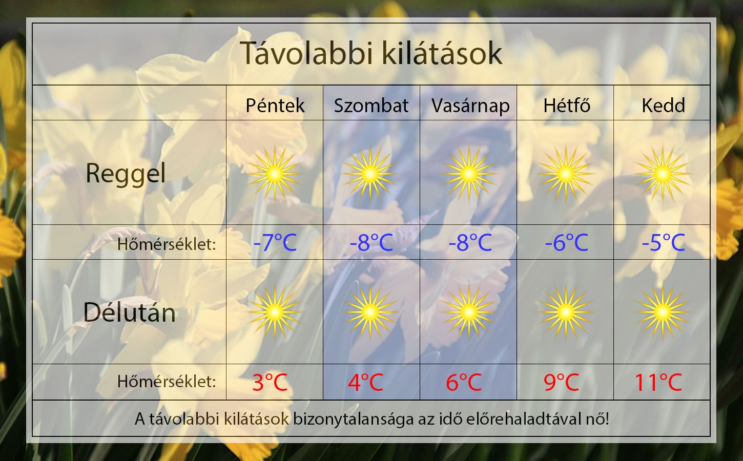 Pénteken reggel -7°C-ig hűl a levegő a derült ég alatt. Délután a hőmérséklet csak 3 fokig emelkedik majd a szikrázó napsütés mellett.