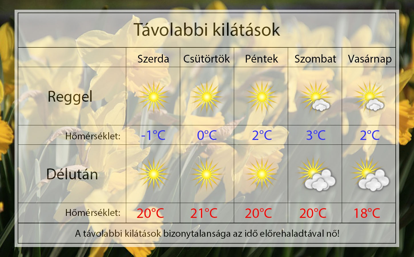 A hét második felében igazán kellemes, tavaszias idő lesz, bár a hétvégén esélyes, hogy kisebb lehűlés érkezik, de délutánonként kellemesen meleg idő várható 20 °C-kal és sok napsütéssel. Reggelente még hűvös lehet, mert a hőmérséklet közel lesz a fagyponthoz. Gyengén fúj majd a szél, sőt néha szélcsend lesz, és emiatt sokkal kellemesebbnek érezzük majd az időjárást.