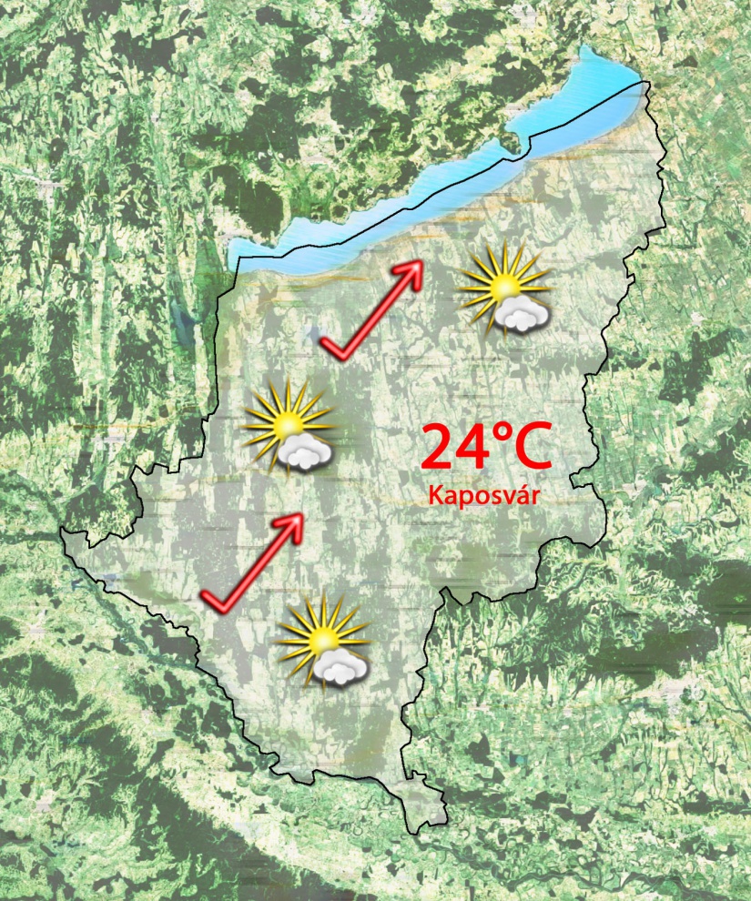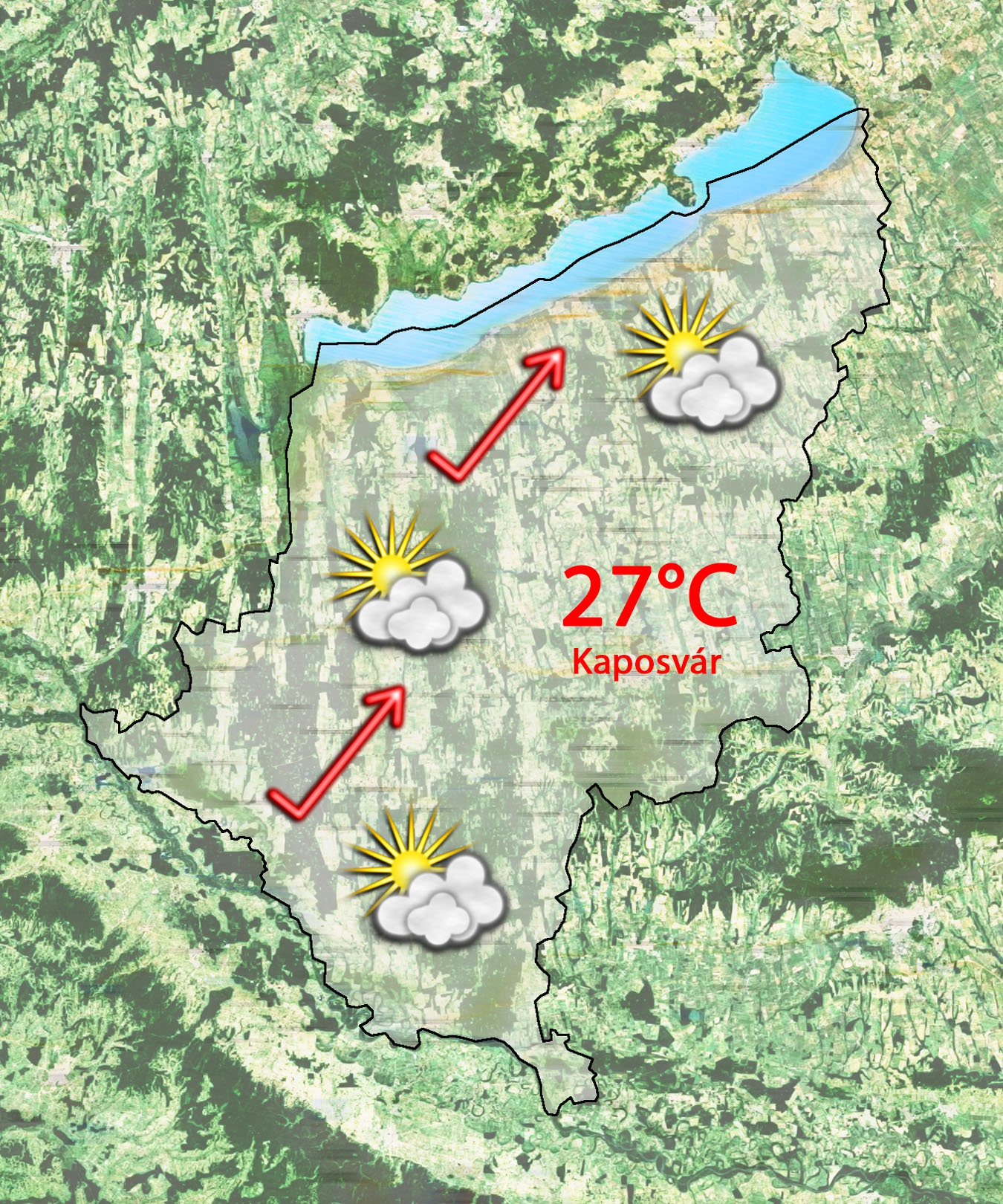 Csütörtök reggel 6°C-ig csökken a hőmérséklet a derült ég alatt. Napközben gyengén felhős lesz az ég. Délután 29 fokig emelkedik a hőmérő higanyszála. Délnyugat felől fog fújni a szél.