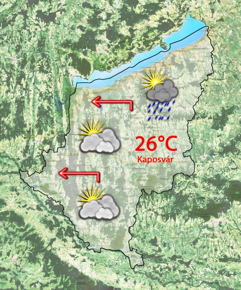 Szerdán reggel 11°C-ig csökken a hőmérséklet a közepesen felhős ég alatt. Napközben megnövekszik a felhőzet és egyre több helyen lehet zápor, zivatar. Néhol akár heves zivatar is előfordulhat. Délután 30 fokig melegszik a levegő. A szél délnyugat felől fúj majd gyengén.