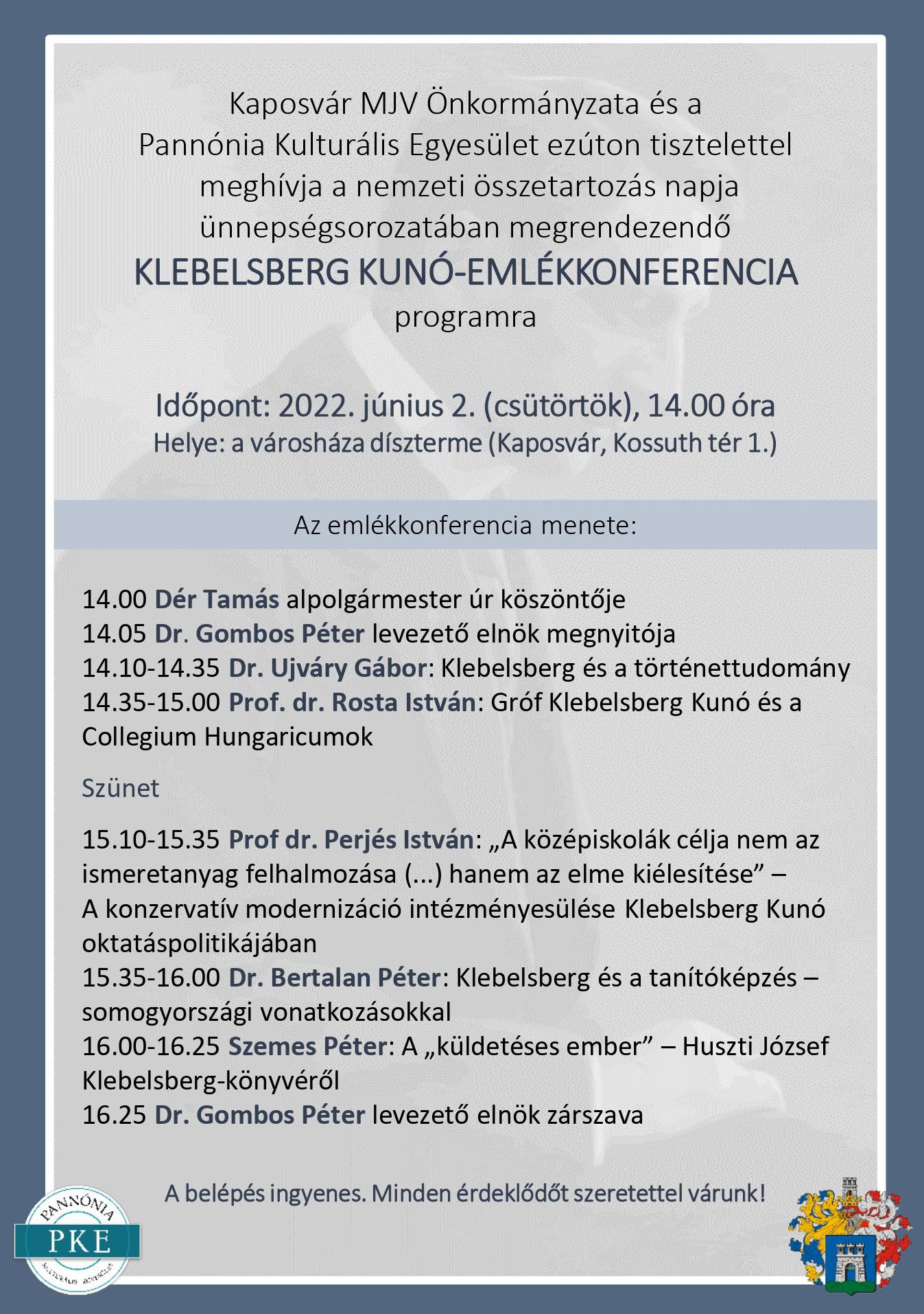 Szerdán a városháza dísztermében bemutatják "A Kaposvár és az első világháború" című könyvet, másnap pedig Klebelsberg-konferenciát tartanak ugyancsak a városháza dísztermében a 100 évvel ezelőtt vallás- és közoktatásügyi miniszterré kinevezett gróf Klebelsberg Kunó emléke előtt tisztelegve.