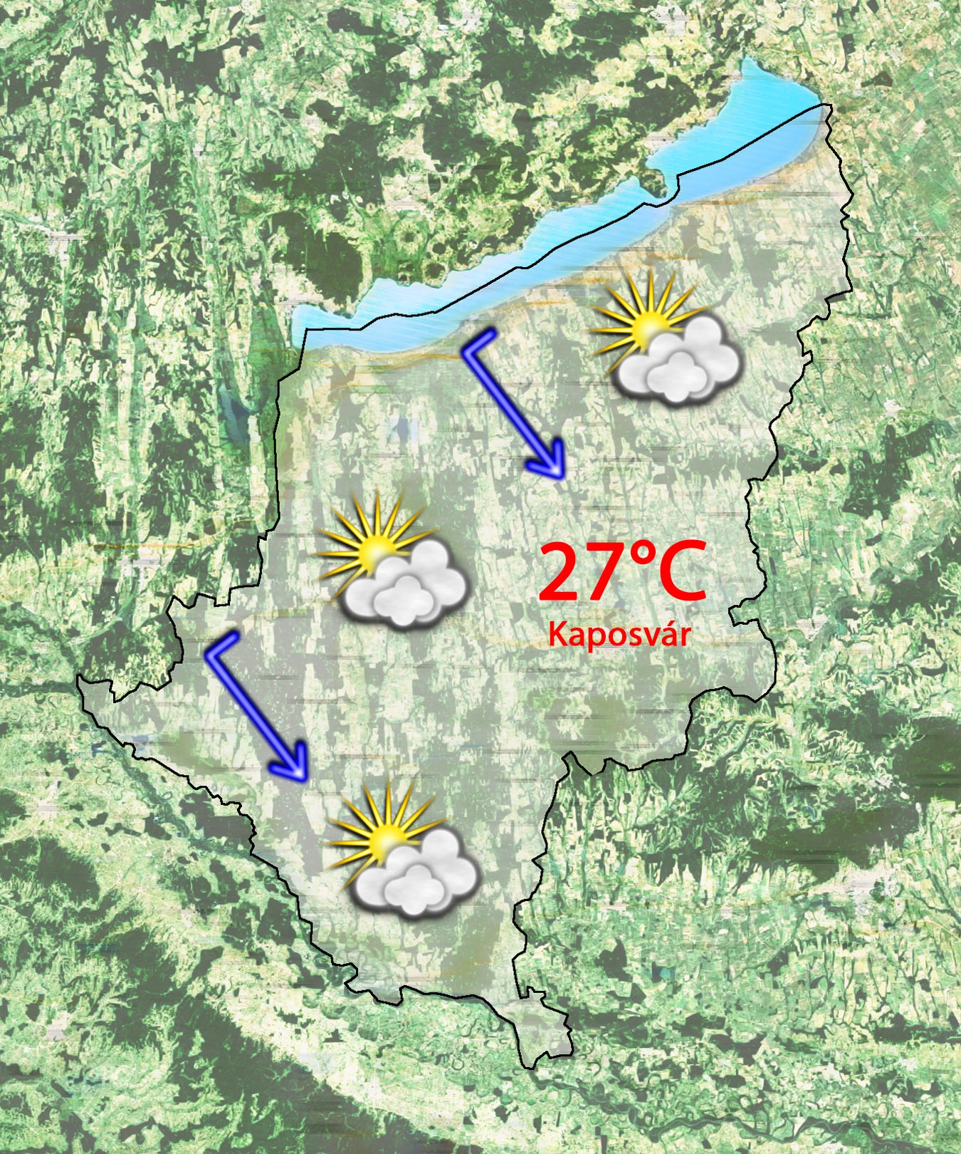 Szerdán napközben erősen felhős lesz az ég és 28°C-ig melegszik a levegő hőmérséklete. A délután folyamán egyre többfelé kell számítani záporra, zivatarra. Heves zivatar sem kizárt, melyet nagyméretű jég kísérhet. Kiadós csapadék is esélyes szinte bárhol. Gyenge lesz az északnyugati szél.