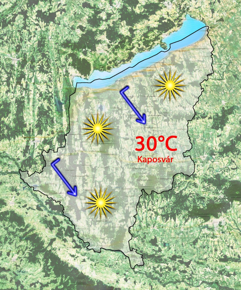 Vasárnap reggel 15 °C-ig hűl a levegő a derült ég alatt. Napközben 30 °C-ig szökik fel a hőmérő higanyszála. Marad még a viszonylag friss idő. Gyengén fúj majd az északnyugati szél.