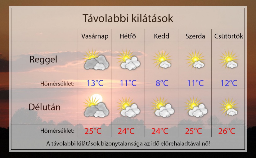 A jövő hét első felében még friss lesz az idő, sőt reggel akár hűvös is lehet. Néhol akár 10°C alá is hűlhet a levegő, míg napközben 22-25 fok között alakul a maximum. Csökken a felhőzet és napos idő várható néha fátyol, néha gomolyfelhőkkel. Csapadékra már nem kell számítani.