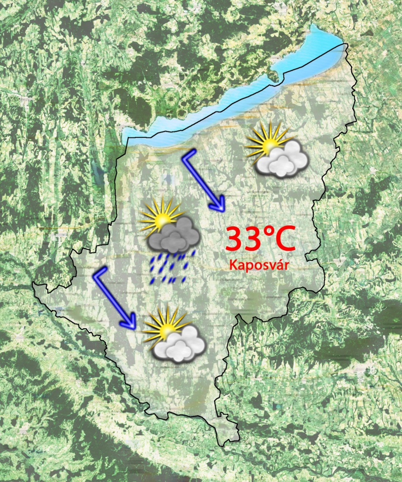 Csütörtök reggel 14°C-ig csökken a hőmérséklet a gyengén felhős ég alatt. Napközben megnövekszik a felhőzet de csapadék nem várható. Délután 33 fokig emelkedik a hőmérő higanyszála. Nyugat felől fog fújni a szél néha élénken.