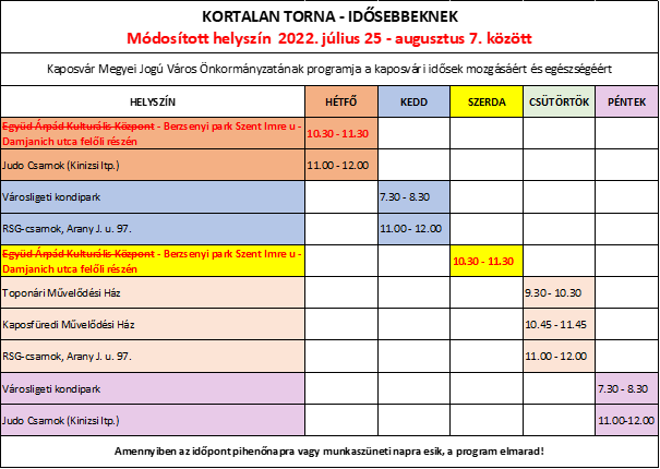 Két hétre megváltozik a Kortalan Torna órarendje. A július 25-én, illetve augusztus 1-én kezdődő hetekben hétfőn és szerdán az Együd Árpád Kulturális Központ helyett a Berzsenyi parkban, a Szent Imre utca és Damjanich utca felőli részén várják az edzők a 65 év feletti kaposváriakat.