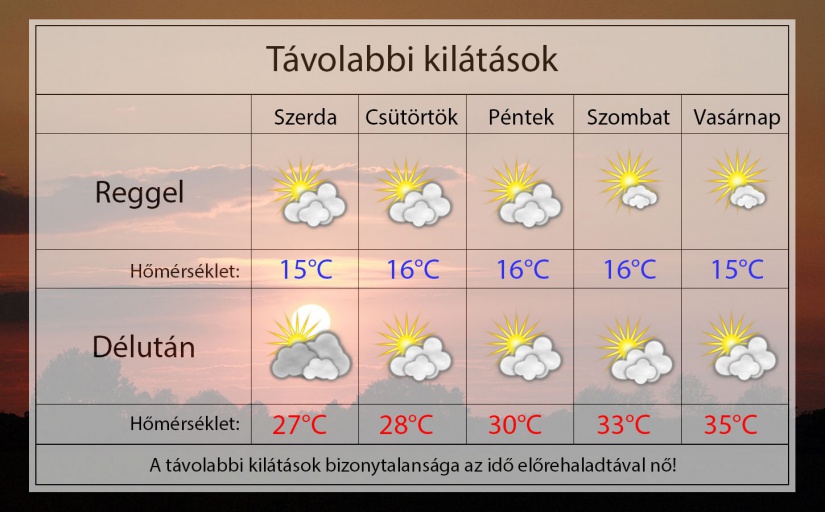 A hét második felében egyre melegebb várható a kevés felhőzet mellett. Eleinte még igazán kellemes későnyárias idő várható, ám a hétvégén már ismét a hőség lesz főszerepben. A reggelek frissek lesznek 15 °C-al, míg napközben 27-30 °C között tetőzik a maximum, de a hétvégén már megközelítheti a hőmérő higanyszála a 35 °C-ot.