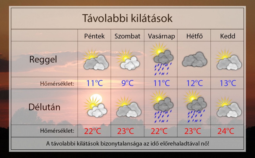 Pénteken reggel 12 °C-ig hűl a levegő az erősen felhős ég alatt. Napközben a fátyolfelhős ég mellett azért fog sütni a nap. Délután csak 22 °C várható a gyenge északi szél mellett.