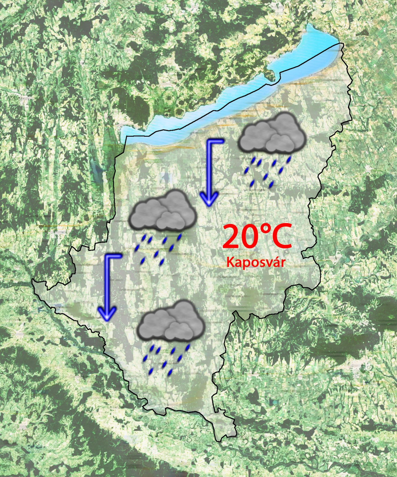 Csütörtök reggel 18 °C-ig csökken a hőmérséklet a már borongós ég alatt. Többfelé kell számítani esőre, záporra, helyenként zivatarra. Napközben esős, őszies idő várható. Délután csak 20 °C-ig emelkedik a hőmérő higanyszála. Gyengén fúj majd az északi szél.