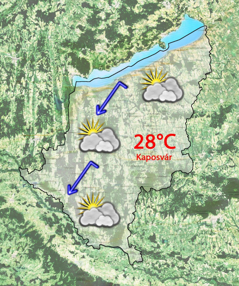 Szerdán napközben közepesen, olykor erősen felhős lesz az ég és 28 °C-ig melegszik a levegő hőmérséklete. Csapadéktól nem kell tartani. Gyenge lesz az északkeleti szél. Késő éjjel megvastagszik a felhőzet.