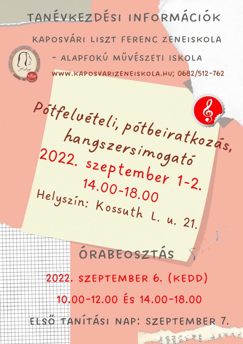 Szeptember elsején és másodikán lesz a pótfelvételi és a pótbeiratkozás a Kaposvári Liszt Ferenc Zeneiskolában, ezzel egybekötve pedig hangszersimogatóra is várják az érdeklődő kis zenészeket.