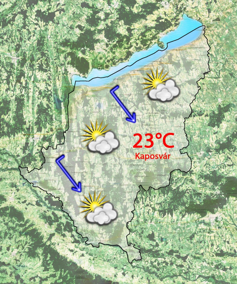 Szerdán reggel kicsit több felhő lesz felettünk és 13°C-ig csökken a hőmérséklet. Napközben megnövekedhet a felhőzet de csapadékra még nem kell számítani. Délután 27 fokig melegszik a levegő. A szél délnyugat felől fúj majd gyengén.