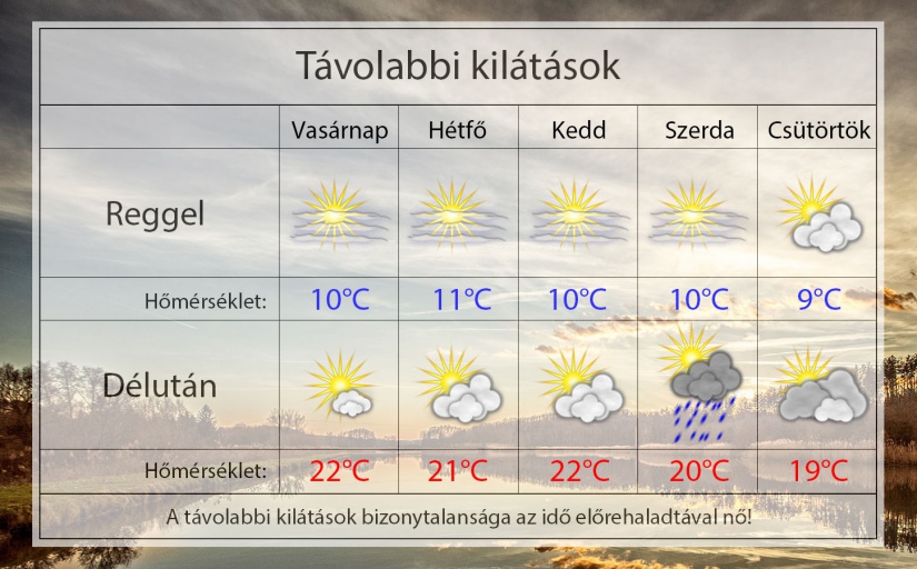 Vasárnap reggel 11°C-ig hűl a levegő a gyengén felhős ég alatt. Napközben 22 fokig kúszik fel a hőmérő higanyszála a gyengén felhős ég alatt. Gyengén fúj majd a déli szél. Melegedés kezdődik.